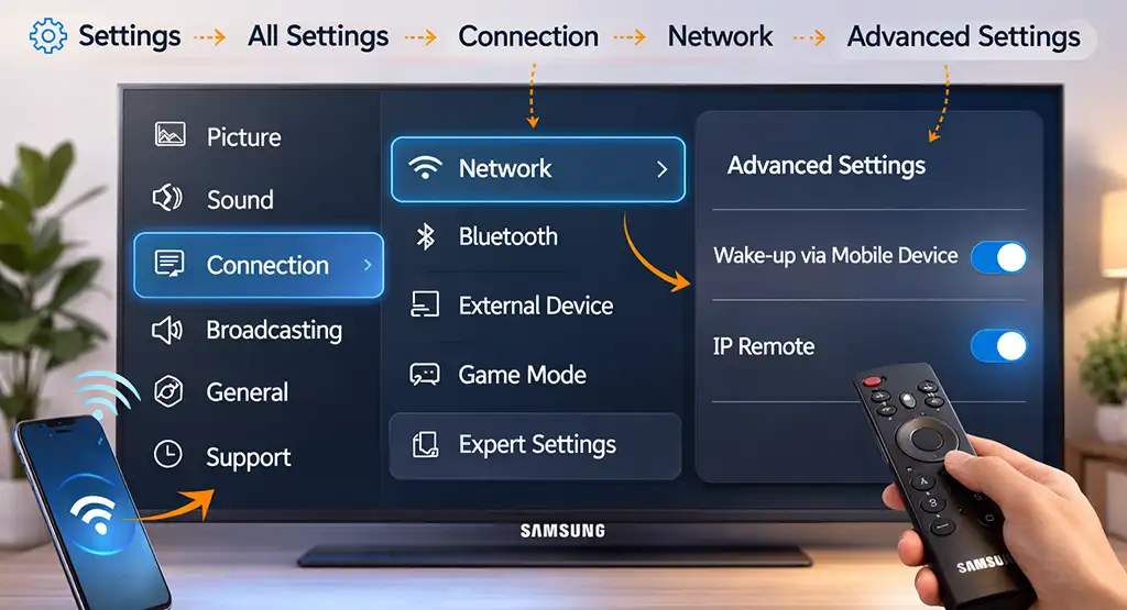 Para ativar «Wake via Mobile Device», vá em «Configurações» → «Todas as Configurações» → «Conexão» → «Rede» → «Configurações Avançadas» e habilite essa opção. O recurso «IP Remote» é ativado no mesmo menu.