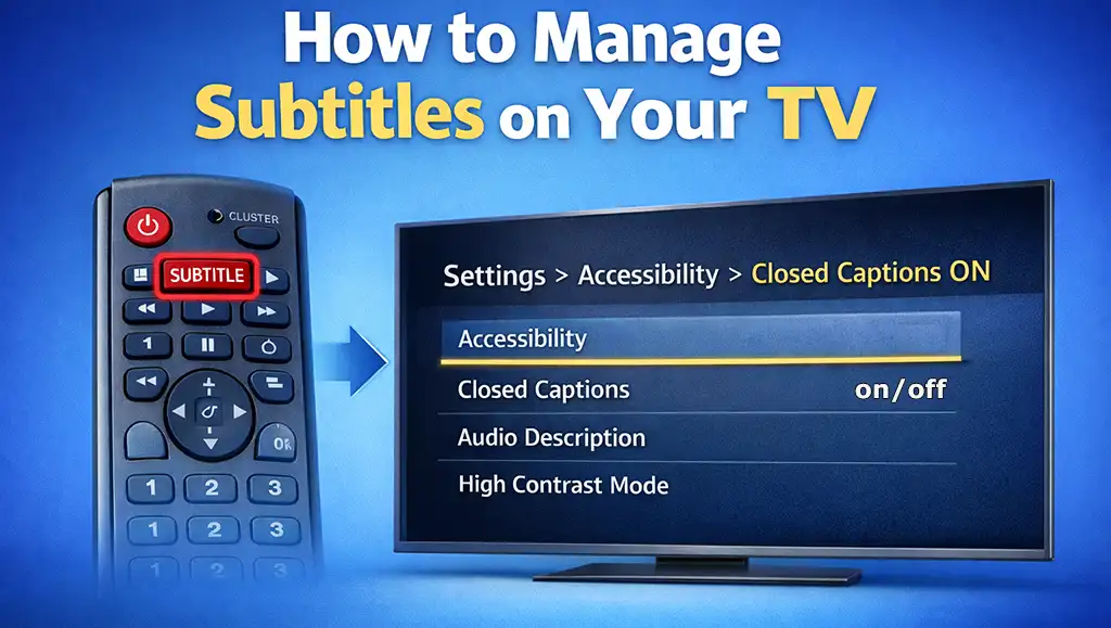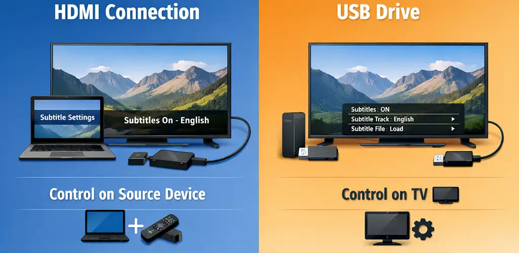 Quando conectado via HDMI, a TV recebe um sinal de vídeo já pronto com as legendas incorporadas. Em outras palavras, a TV funciona essencialmente como um monitor. Isso significa que todas as configurações — ativar ou desativar legendas, selecionar idioma ou formato de exibição — são feitas no dispositivo de origem, como um notebook ou um dispositivo de streaming como o Amazon Fire TV Stick.