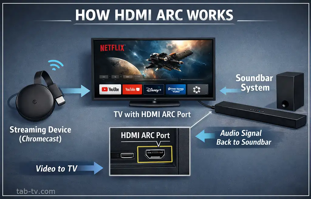 HDMI ARC ou eARC é usado para transmitir áudio da TV para dispositivos de áudio externos, como soundbars. Se essa função não for necessária, a porta pode ser usada como uma HDMI padrão.