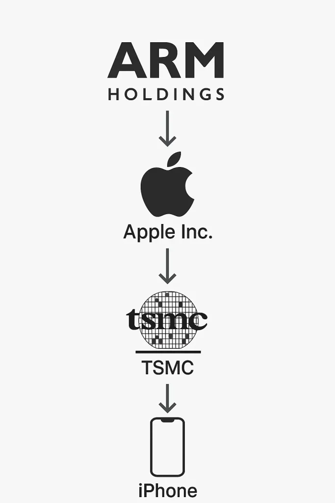 A Apple é uma das licenciadas da ARM. Em seus laboratórios, os engenheiros da Apple utilizam a arquitetura ARM como base e criam núcleos de CPU personalizados e componentes complementares adaptados aos dispositivos da empresa.