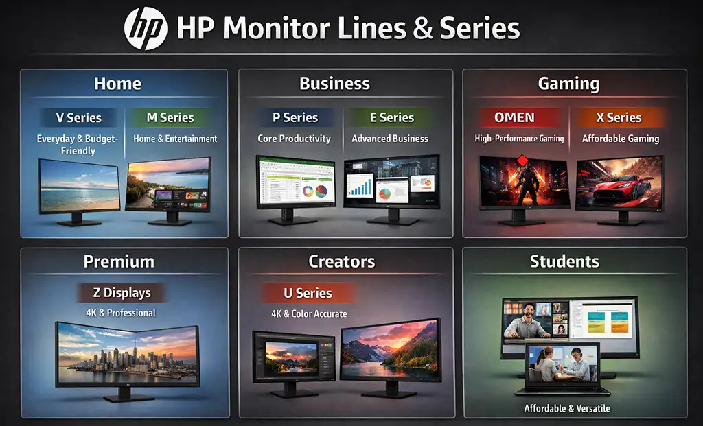 A HP oferece várias linhas de monitores, cada uma projetada para atender às necessidades específicas dos usuários e alinhada às estratégias de marketing. Se alguém estiver escolhendo um monitor para trabalho, naturalmente considerará os monitores destinados a ambientes de escritório ou profissionais.